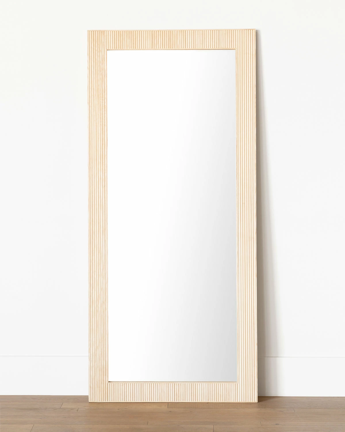 With subtle texture from the vertical ribbed oak frame, the Rowan Wall Mirror is charming and organic. Its simple shape is subtly dramatic, adding a modern touch to your styling, whether in an entryway or bedroom. Oversized yet understated, the floor mirror opens a room, bringing a calming depth to your space.
