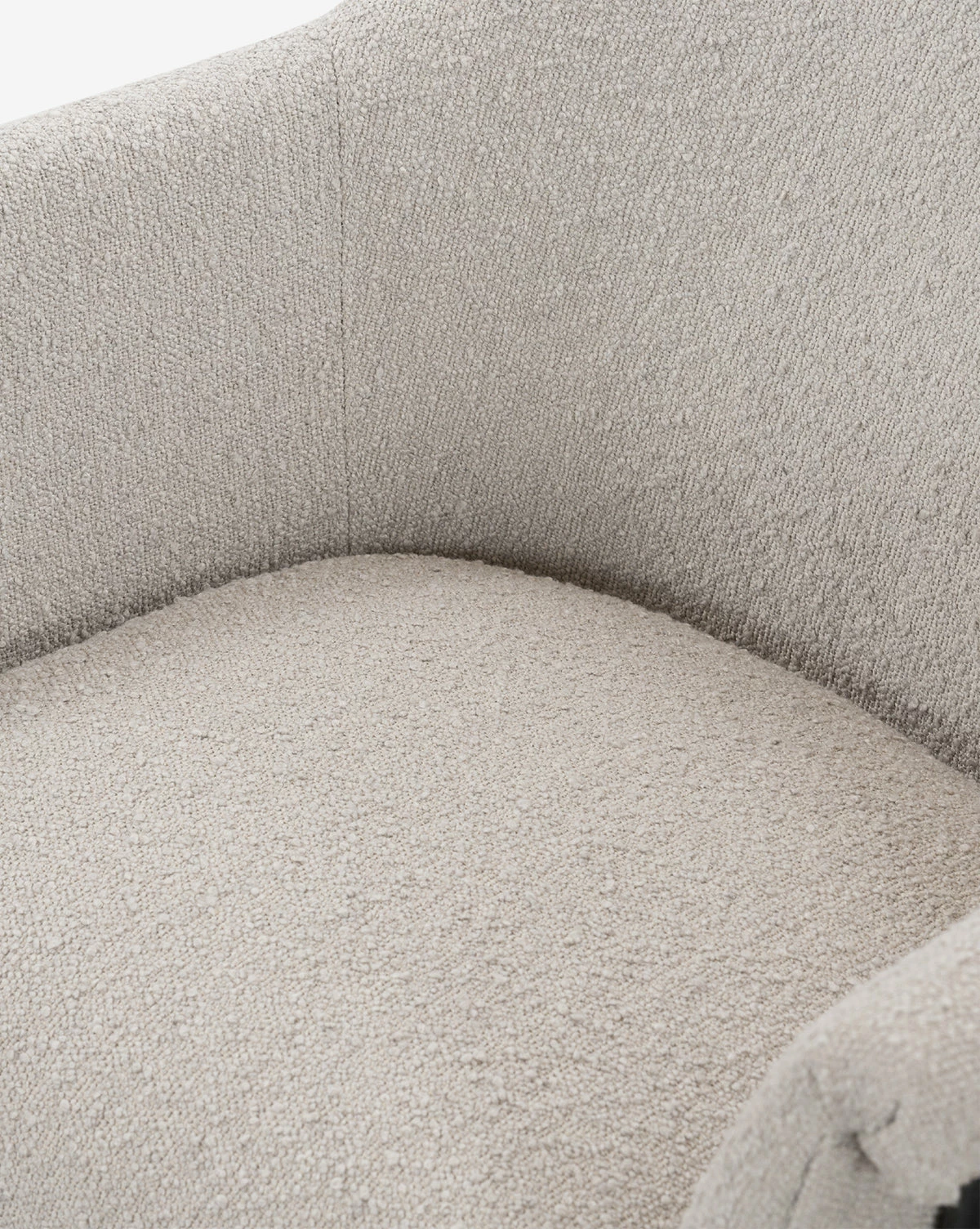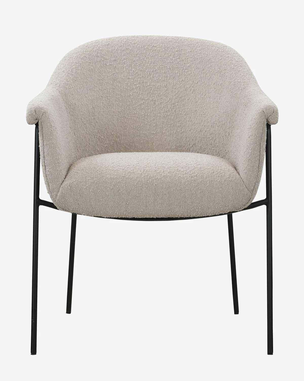 A vintage-inspired accent seat, the Sabbath Dining Chair has a slender frame of black-finished iron that beautifully balances the scale of the plush chair. Upholstered in textured performance fabric, the curvy silhouette and classic rolled arms create a refined and inviting chair.
