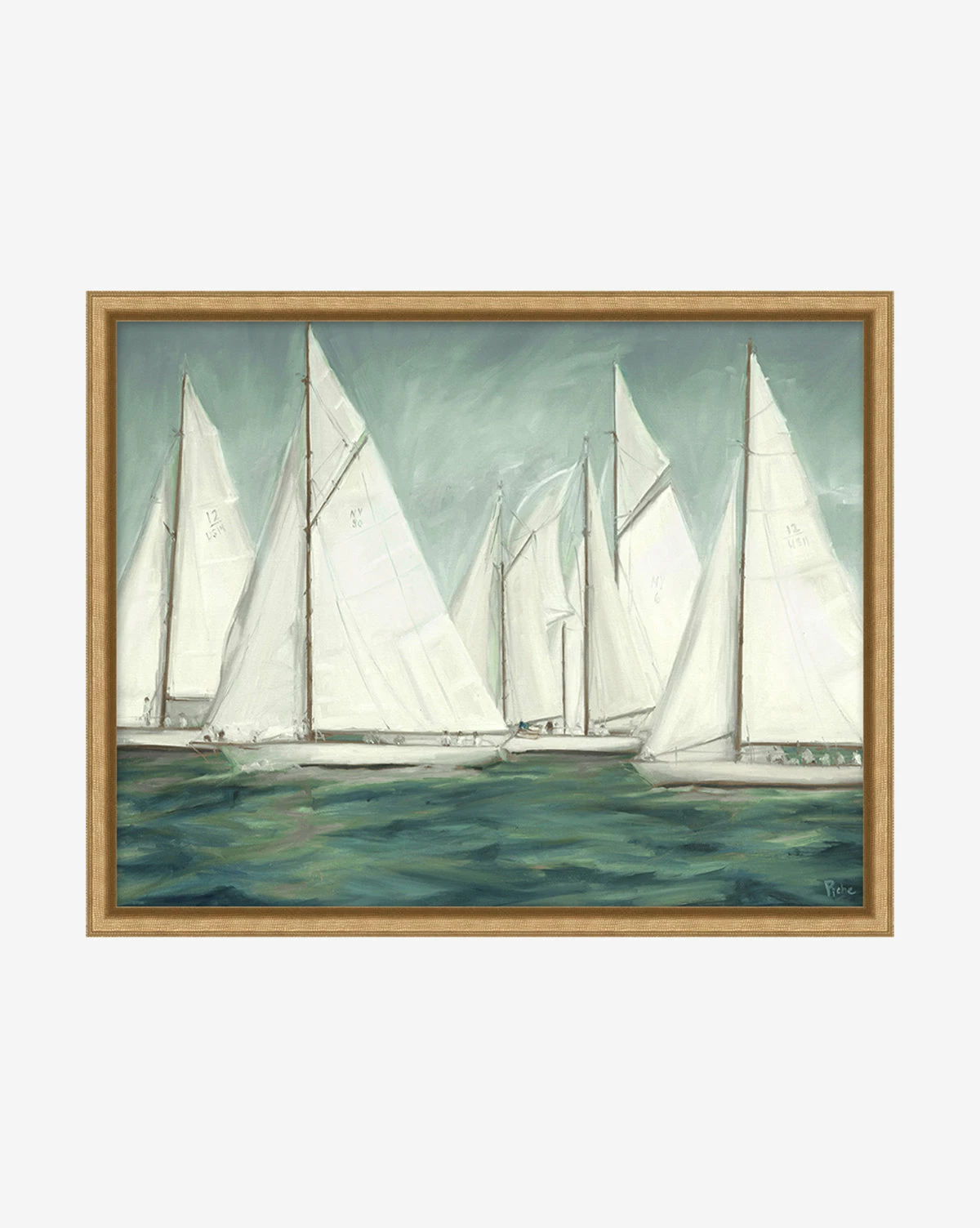 Layered sailboats create dimension and direct the eye in Sailing Ships. In a cool-toned palette of blues and greens, the piece is detailed with simple shapes that fill its frame. Its geometric shapes are tapered and imperfect, giving an organic flow to Sailing Ships that blends maturity with playfulness.