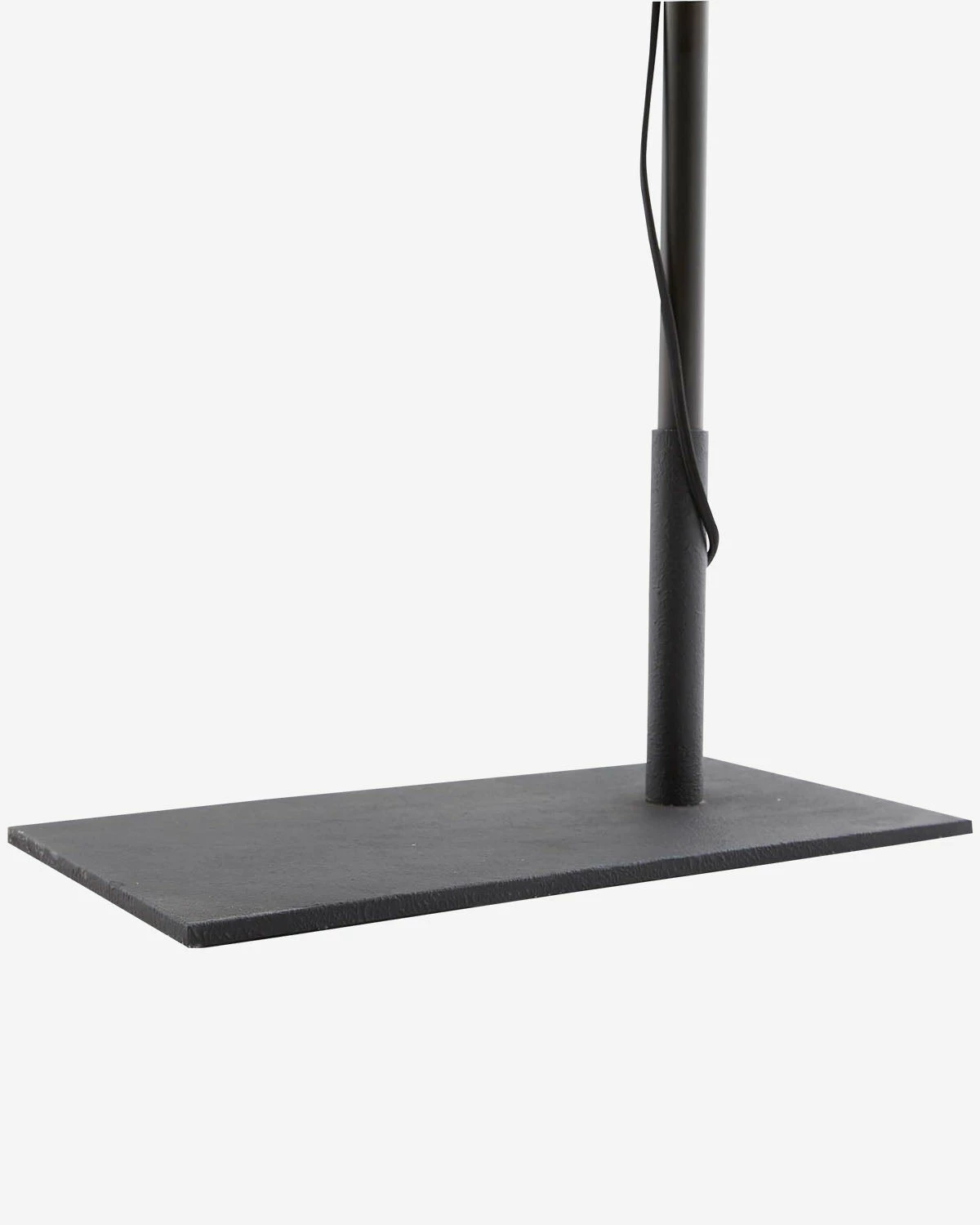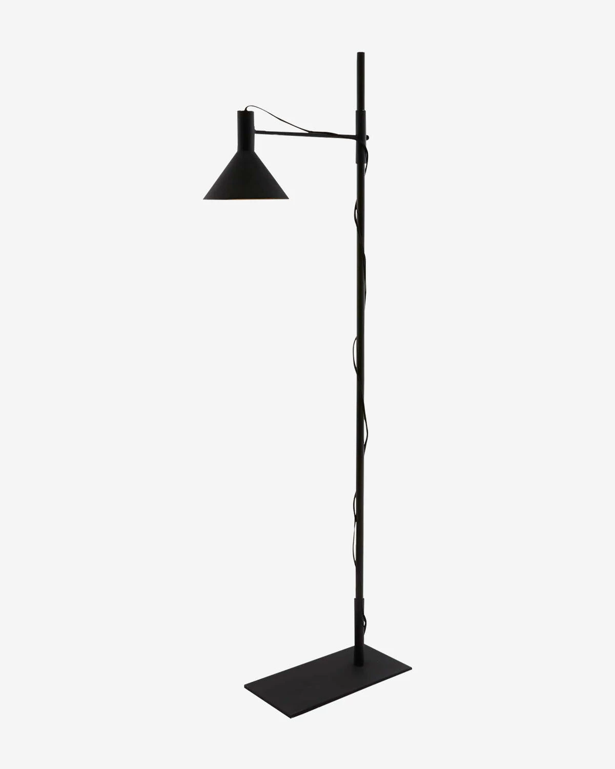 Elegant and modern, the Salem Floor Lamp takes inspiration from a reading light design with a directional light and intentionally exposed black cloth cord. Its sleek base is made from a textured, matte charcoal iron, bringing a subtle industrial feel to the lamp.