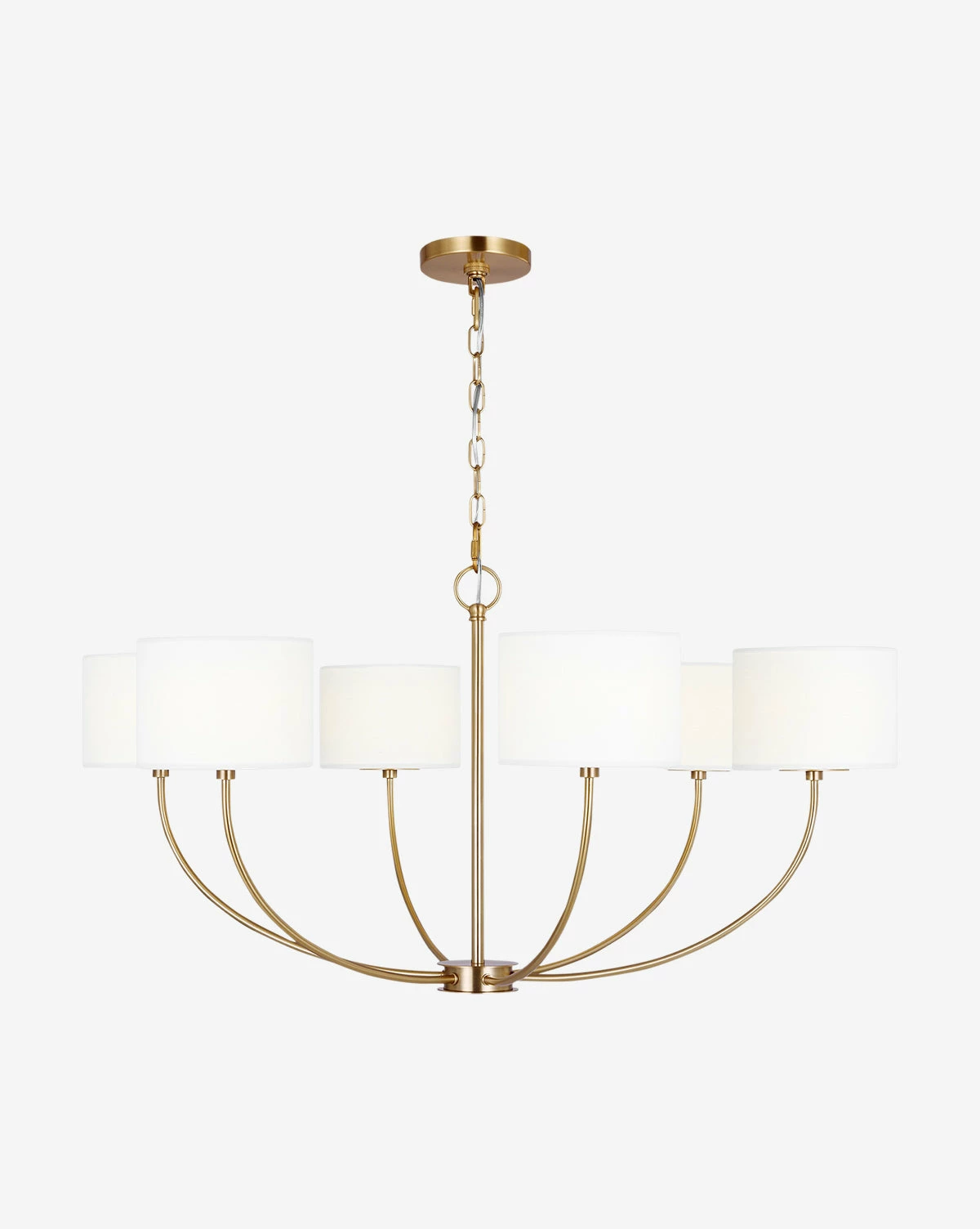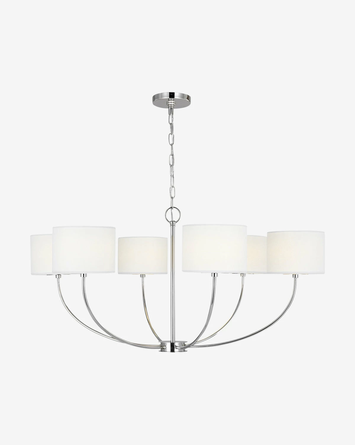Contemporary in design, the Sawyer Medium Chandelier makes its presence known with its distinctive form. Featuring curved arms with small drum shades made of white linen with a silk diffuser, the metal structure is available in two stunning finishes.