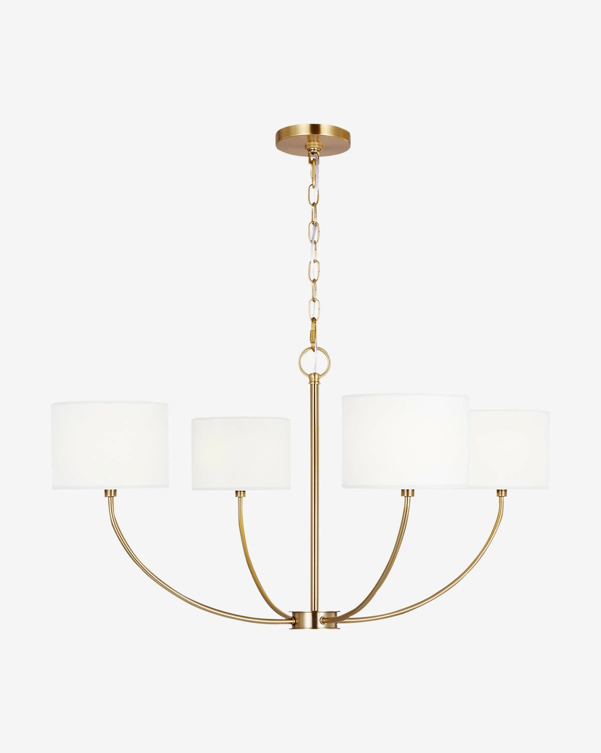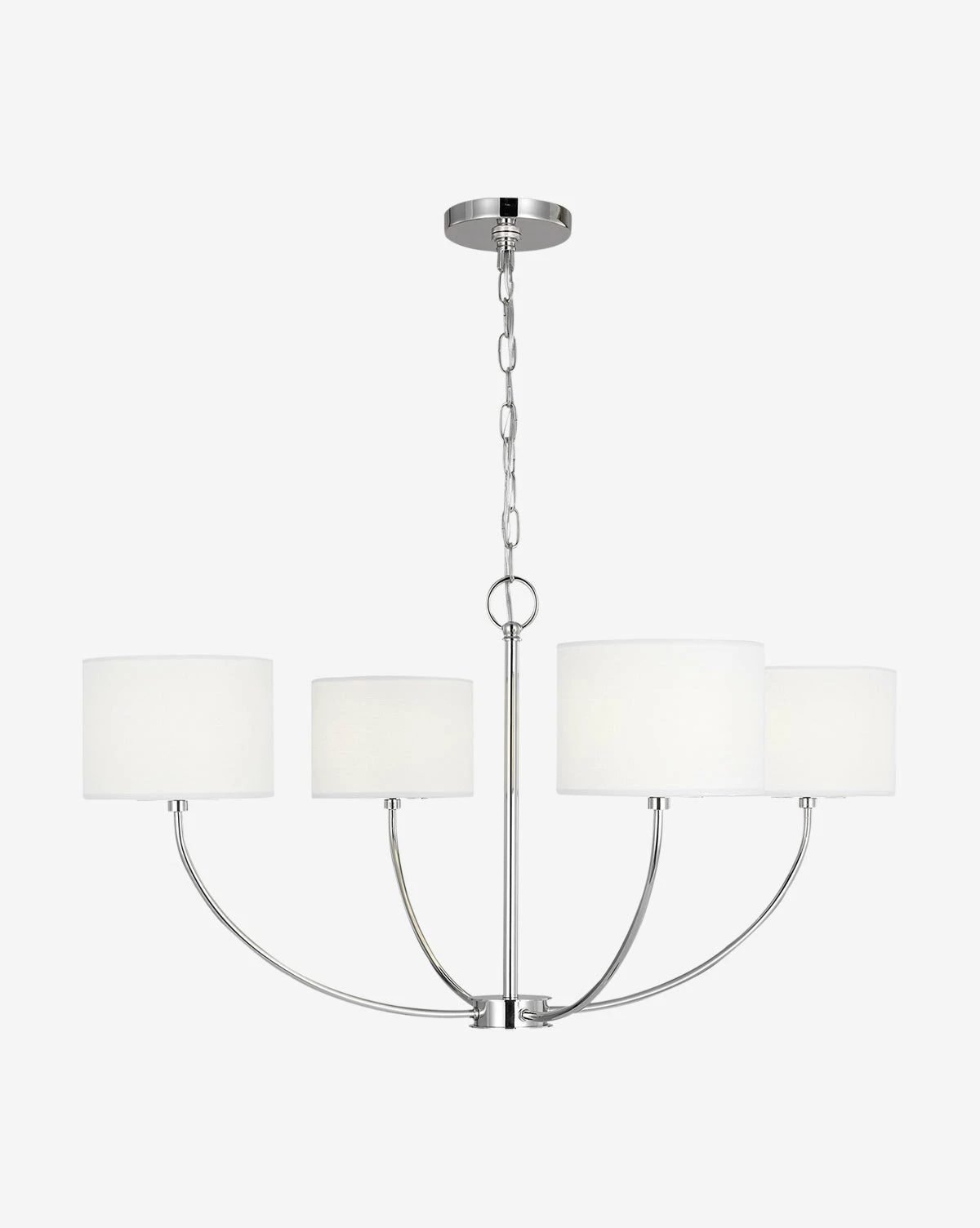 Contemporary in design, the Sawyer Medium Chandelier makes its presence known with its distinctive form. Featuring curved arms with small drum shades made of white linen with a silk diffuser, the metal structure is available in two stunning finishes.