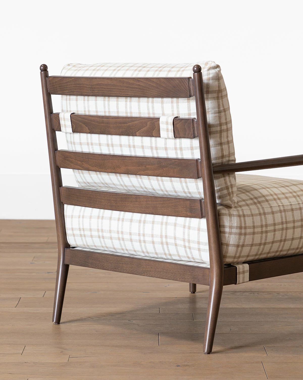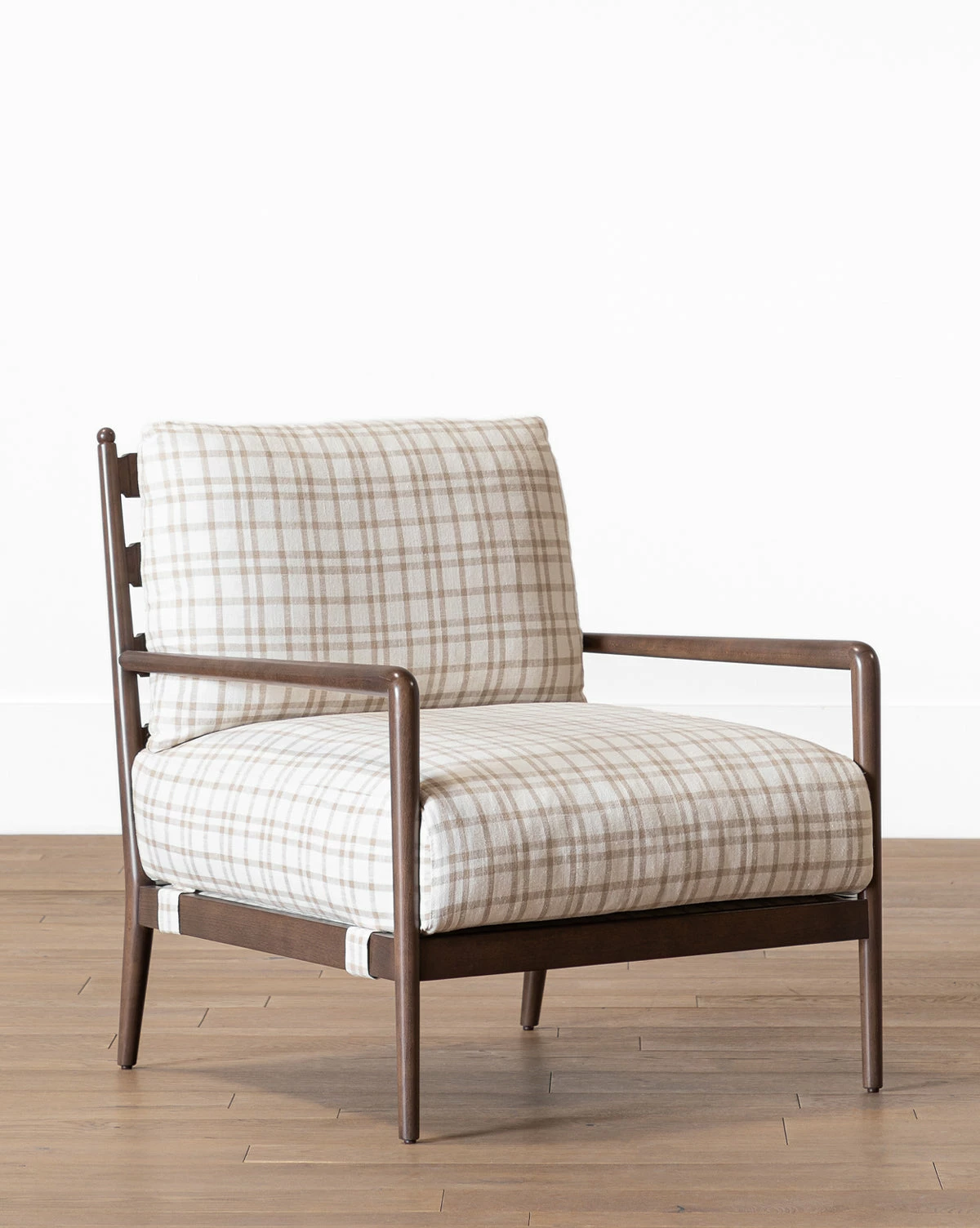 With plaid cushions in a neutral palette, our Serena Wood Lounge Chair brings a comforting traditional design to your space. Its wide frame is made from beech wood, with ladderback details that add both form and function and seamlessly complement its beautiful linen blend fabric.