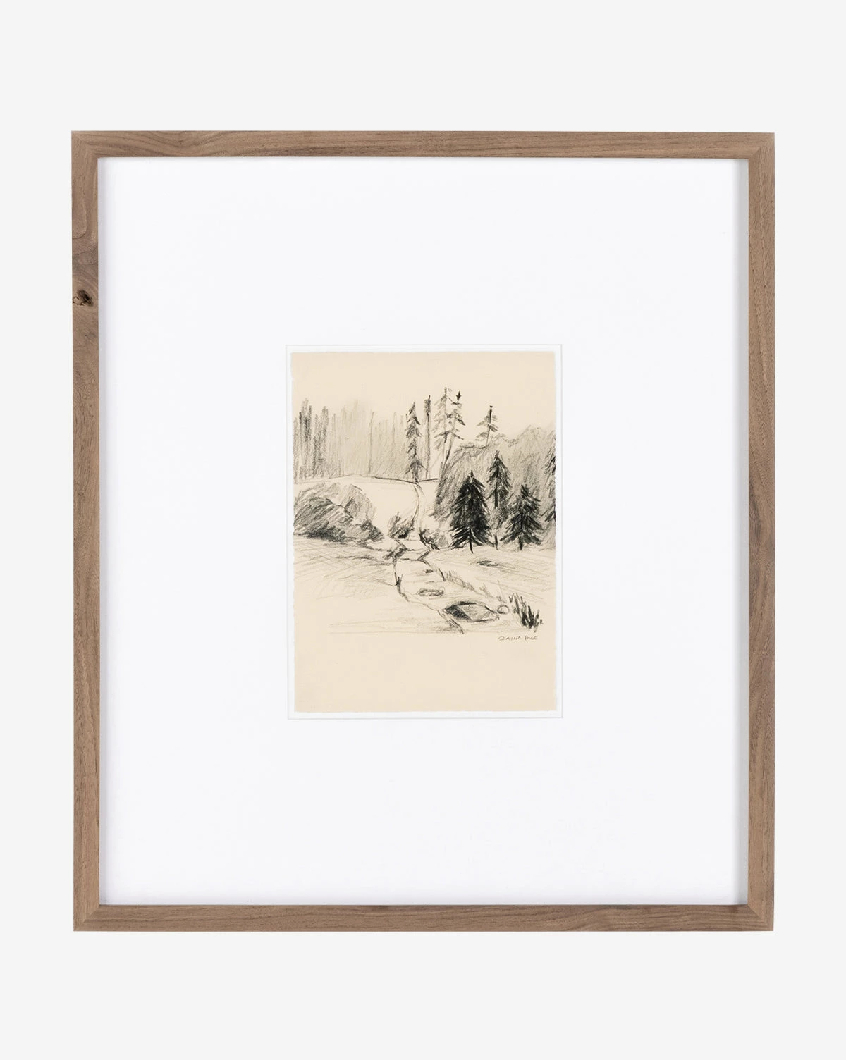 Sketched with expressive shading and lines, Serene Scenery II has a warm and inviting feel. Its composition features stalwart pines along the course of a small stream, highlighting the simultaneous strength and softness of nature. Framed in rustic walnut, Serene Scenery II has an elevated, museum-quality look.