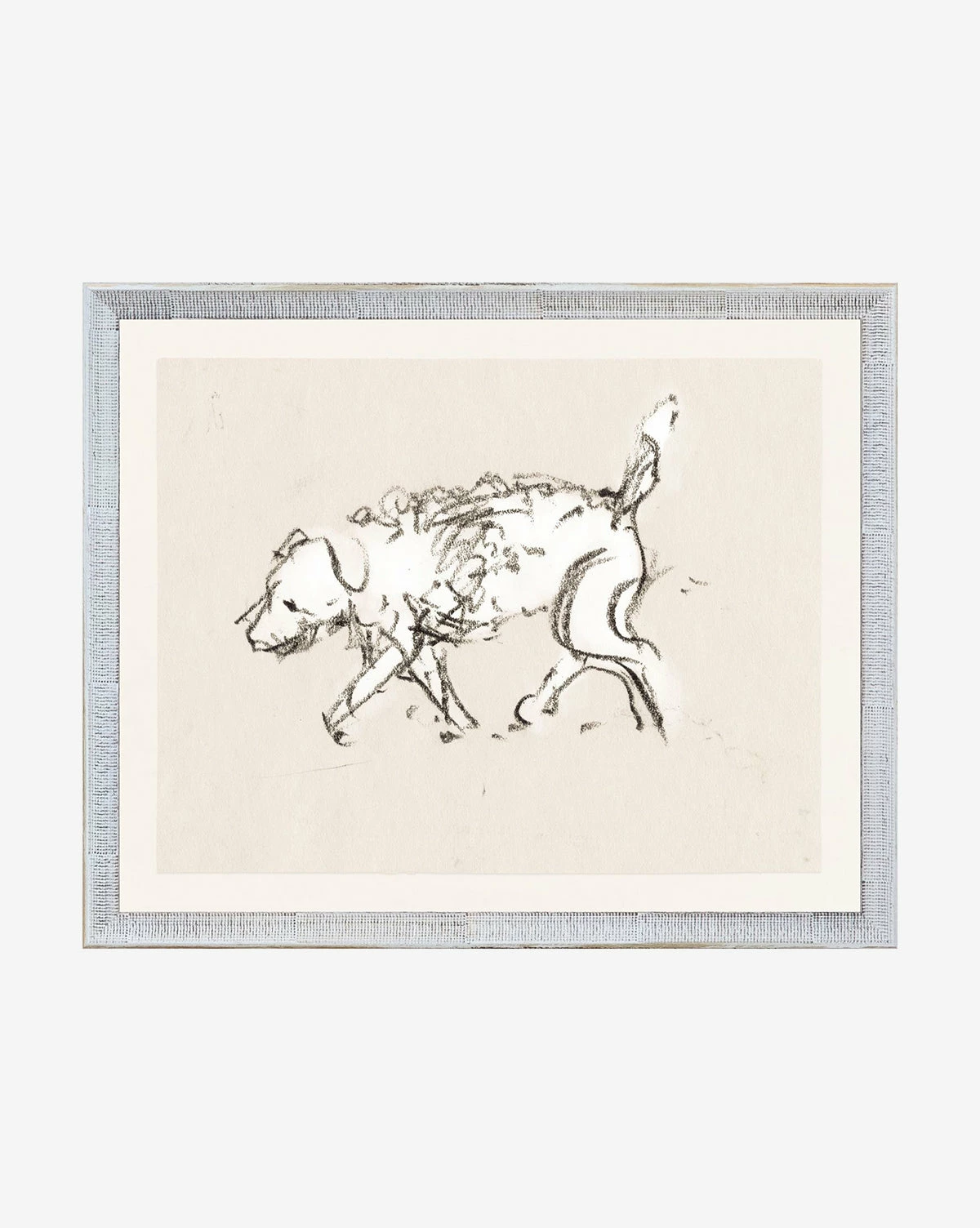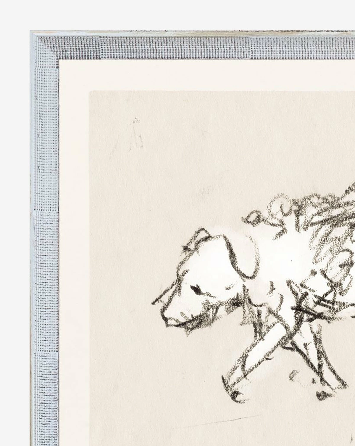 Loosely sketched with charcoal, Shabby Dog is a beautiful print of the original sketch by artist Charles H. Woodbury. This historical print is filled with playful movement, and is presented in a silver, textured wood frame. Encased in clear grade-A glass, Shabby Dog is given museum-quality treatment that makes it a fun yet elevated addition to children’s rooms. Â
