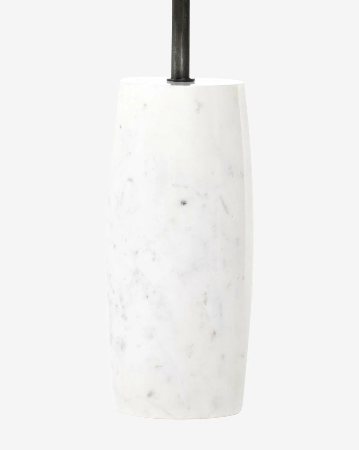 Cylindrical white marble serves as the base of the elegantly industrial Sheba Side Table. Its elongated oval base houses a slender stem and broad, lipped tabletop of aged grey iron. The natural movement of the iron is complemented by the dimensional veining of the marble, bringing direction and life to living spaces that complements sofas and sectionals.