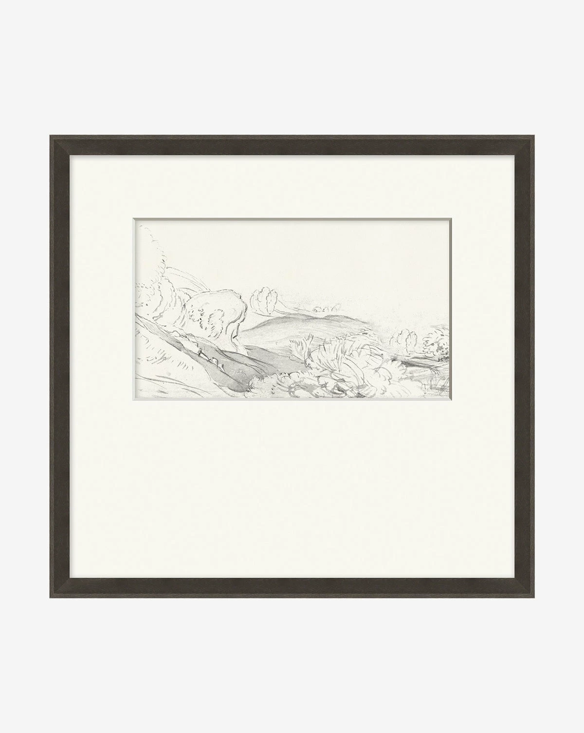 Sketched with expressive shading and lines, Sketch Landscape IIII has a warm and inviting feel. Its composition features a charming hillside scene with movement and detail. Framed in black woodgrain, the artwork has an elevated, museum-quality look.