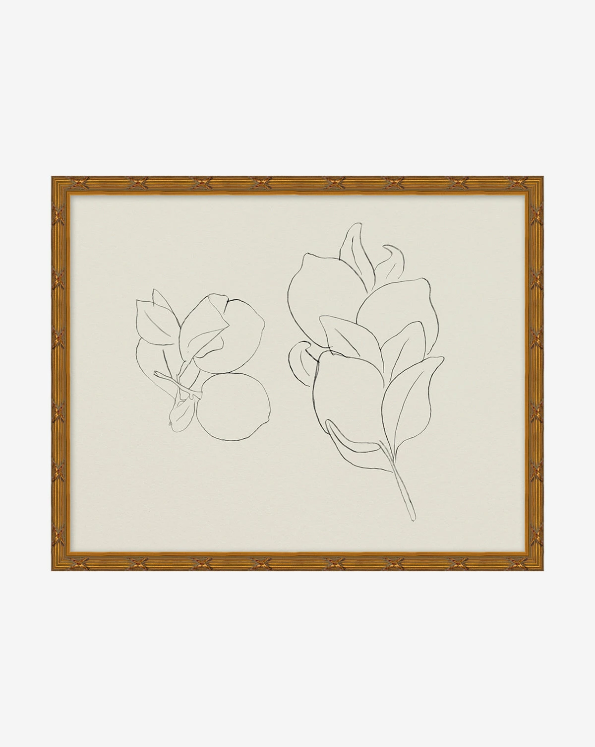 Beauty doesn’t need to be complicated, and Sketched Fruit II embraces the simplicity of nature. Its light pencil sketch captures the form of lemons, and the piece is drawn using only pencil to highlight the profile of the fruit. Offering room for imagination, Sketched Fruit II encourages the viewer to appreciate the simple details of the plant.
