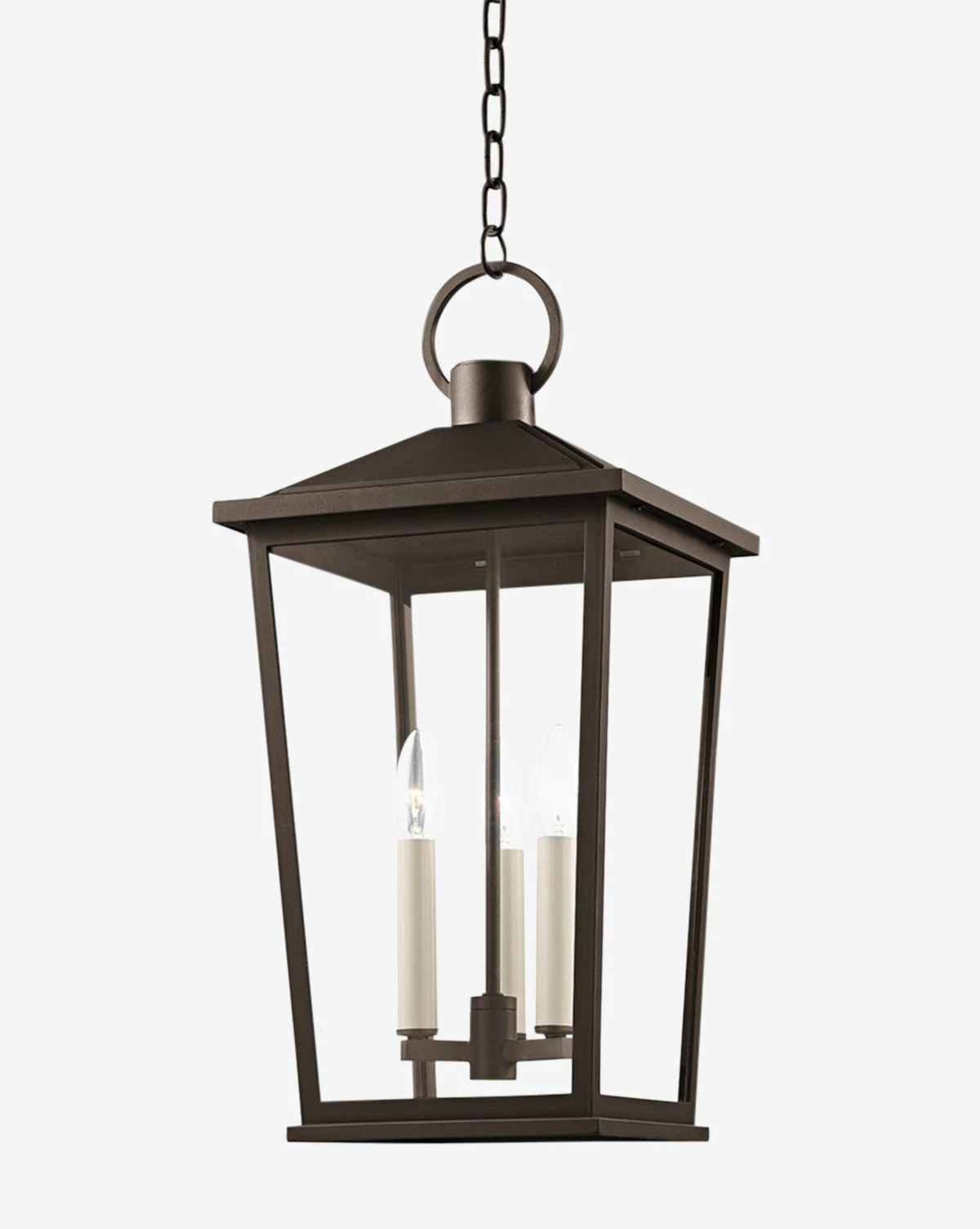 In a textured black finish, the Soren Outdoor Lantern borrows from traditional design to create a fixture that will last. With a classic lantern shape held by a subtle chain, this piece displays a candelabra behind clear glass.