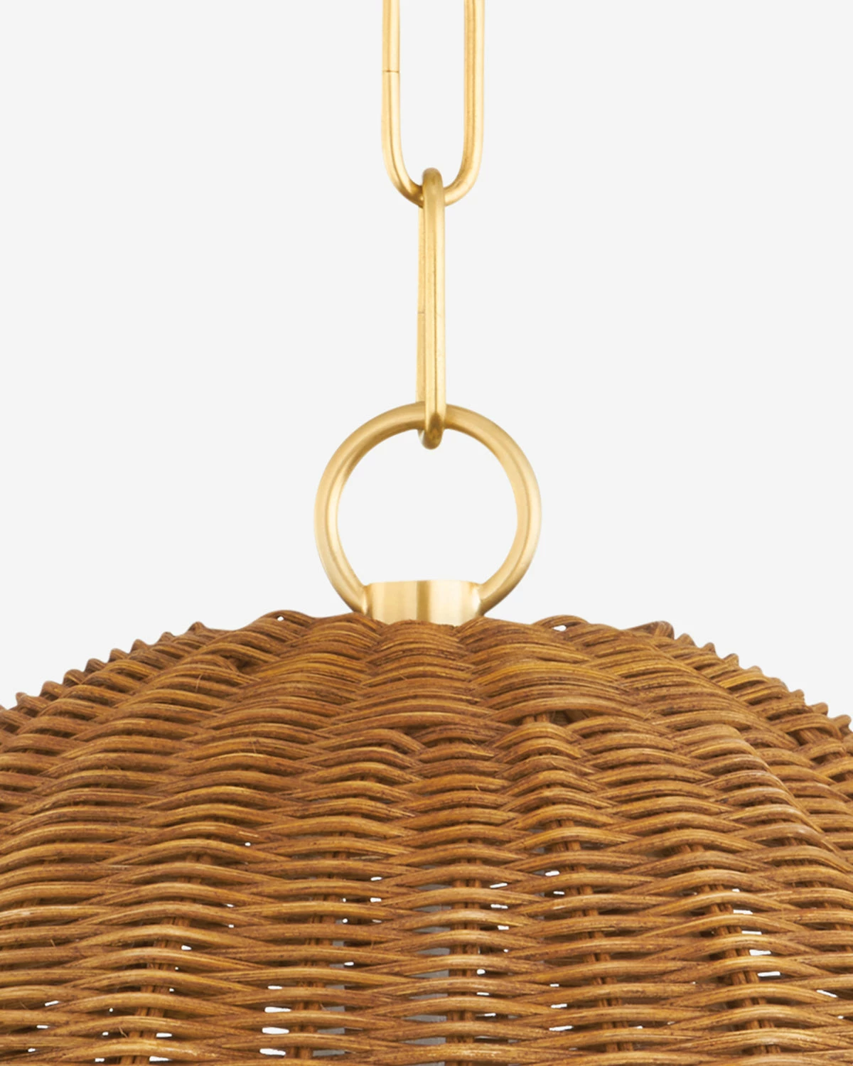 The Summer Pendant brings a contemporary yet organic style to your space with its spherical design and intricately woven rattan. An aged brass chain supports the pendant while the white glass shade allows for evenly dispersed soft light in your space.