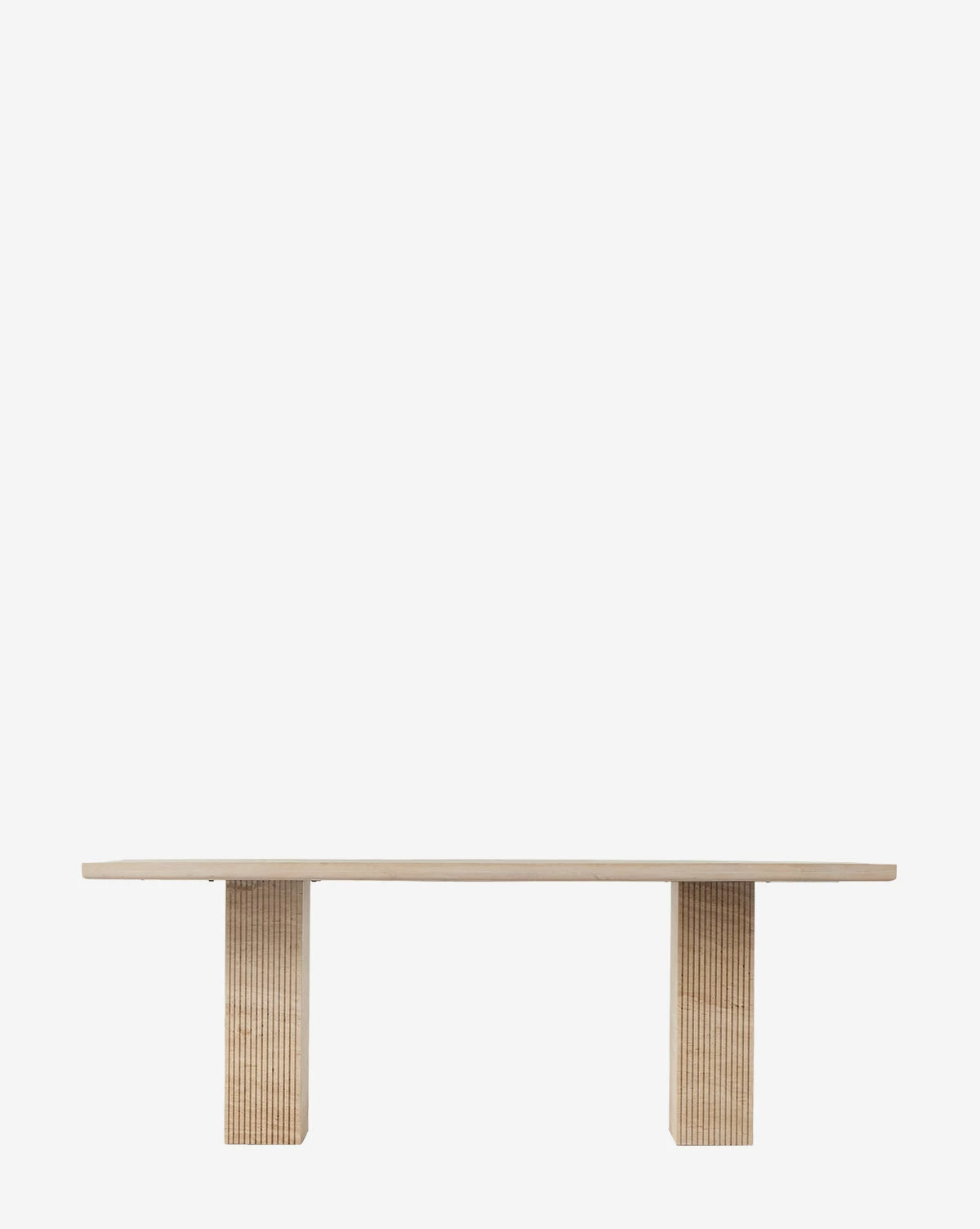 Architectural in design, the Tawny Dining Table features a sophisticated mix of white oak and solid marble. The solid oak table top features subtle organic detail, complementing the reeded natural marble base for an elevated, contemporary style.