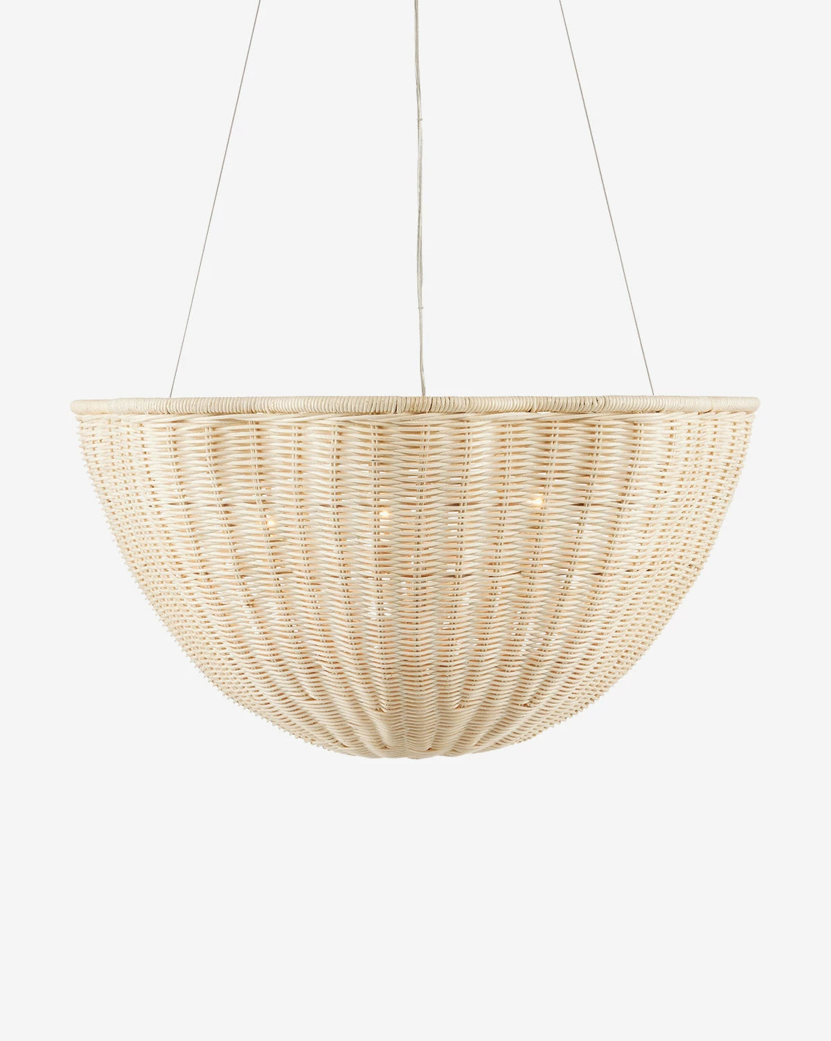 Featuring a woven bowl-shaped structure with woven bleached rattan, the Telos Pendant is romantic and textural. Seamlessly blending organic materials with contemporary design, the pendant brings warm light to your spaces.