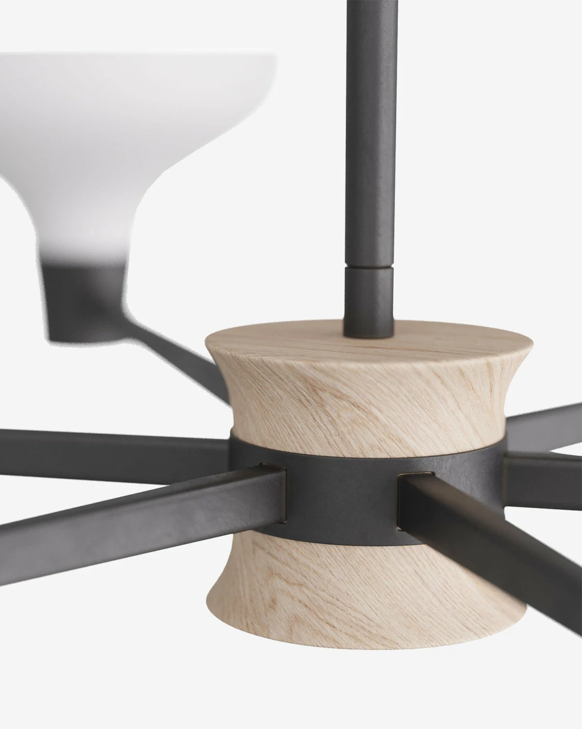 Open and shapely white gesso iron shades draw the eye to the Thatcher Chandelier. With subtly mixed materials, the wood detail on this chandelier brings modern refinement to your decor and a welcoming presence among your interior lighting.