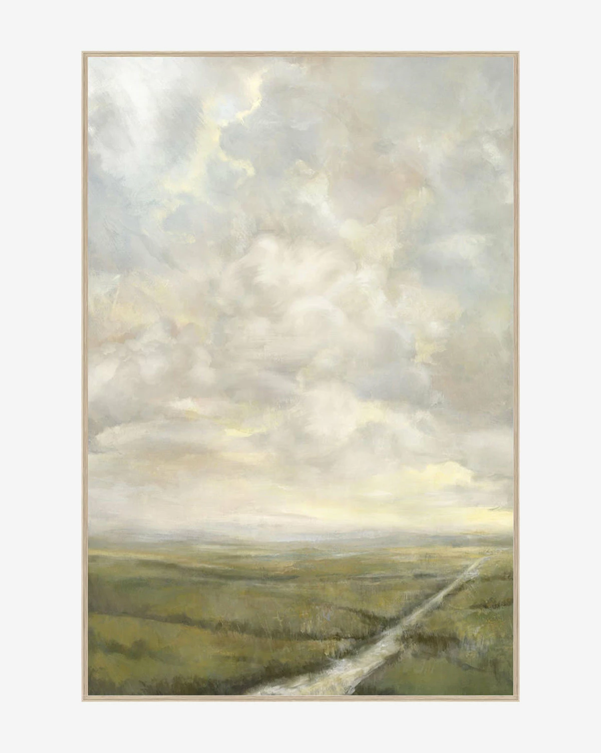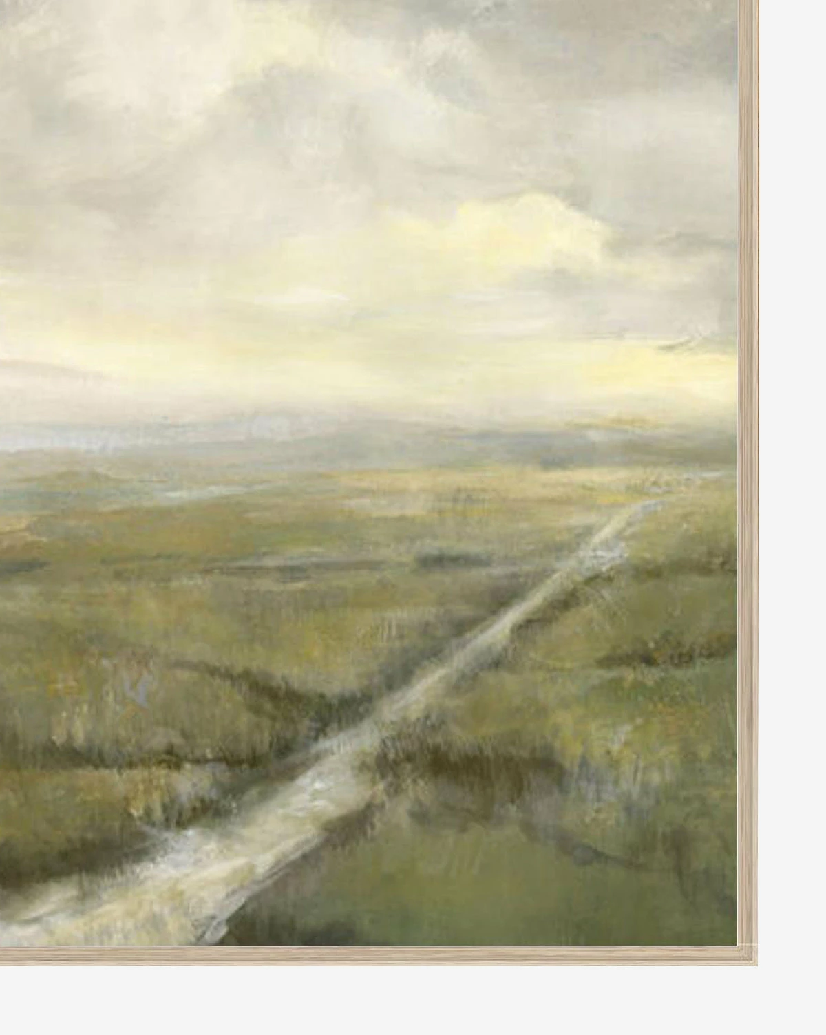 With muted tones of green and gray, Through the Meadow takes the viewer on a journey to a serene place far beyond the meadows. Fitted with a simple wooden frame, this piece creates movement whether its added to a carefully curated gallery wall, or making a statement as part of an entryway vignette.Â