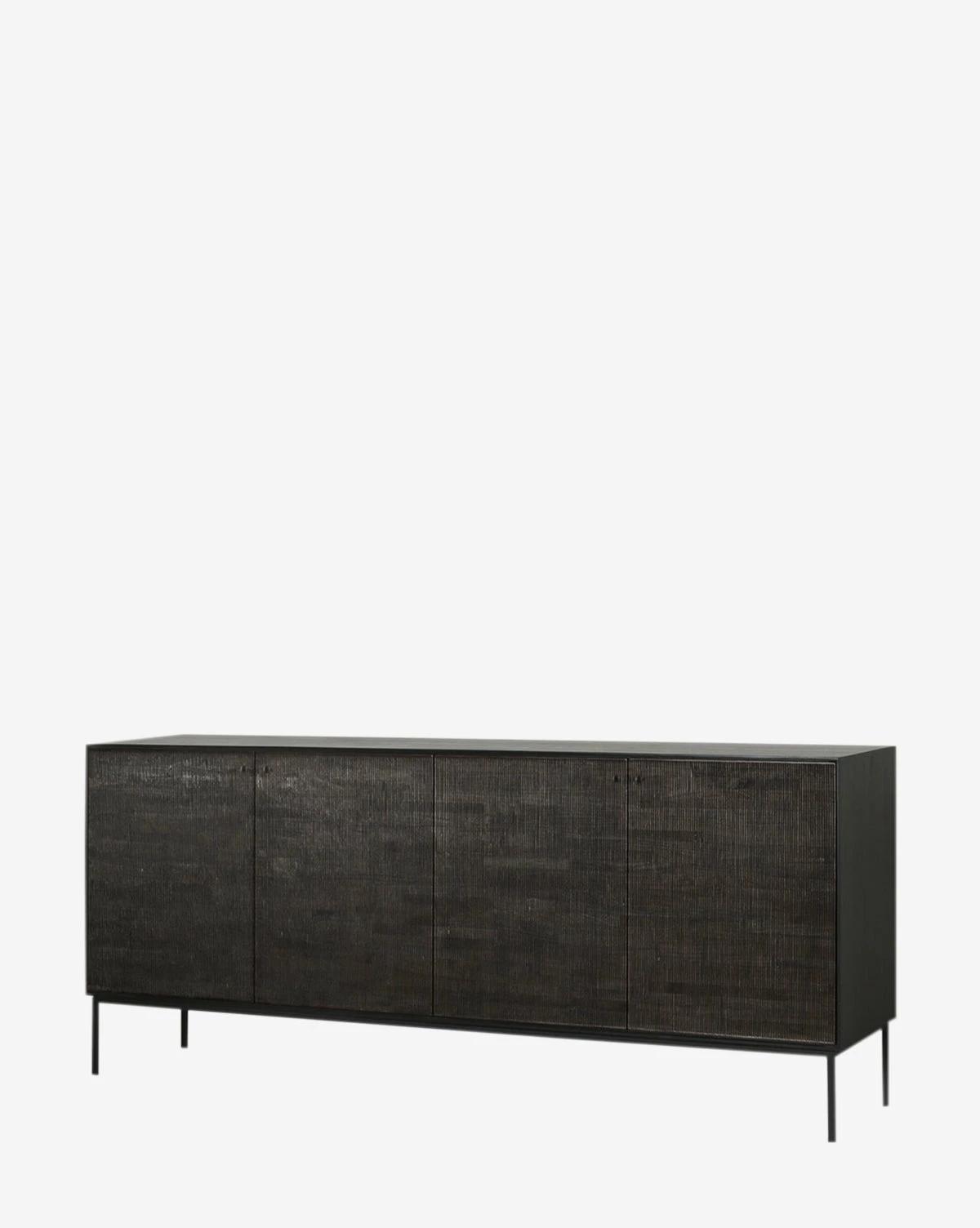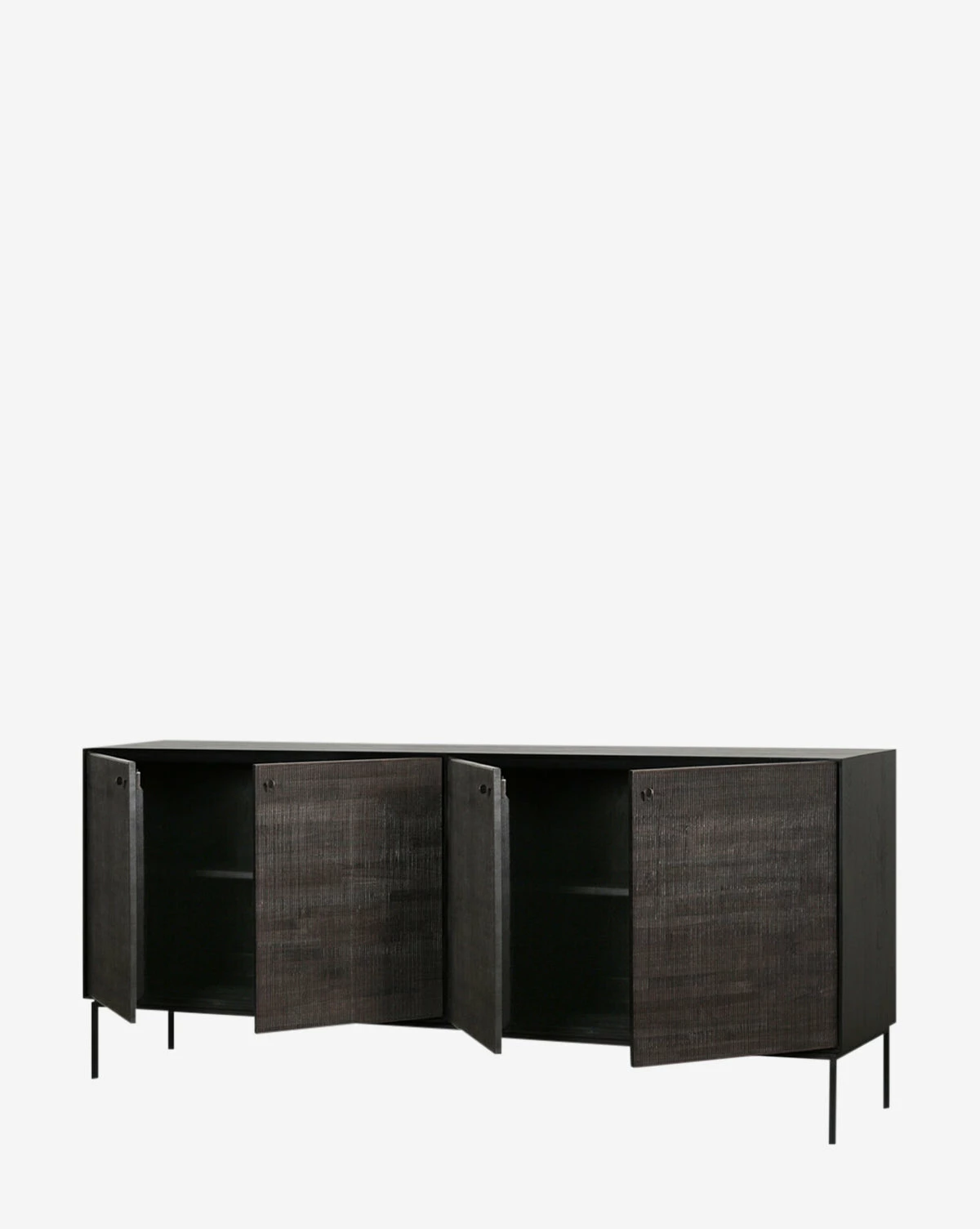 Made from 100% solid teak with a varnish finish and black metal legs, the Vander Sideboard is moody and captivating. Hand-carved textures on each of the four doors create a sense of movement, catching the light throughout the day. With interior shelves and sleek hardware, the sideboard is exceptionally functional.
