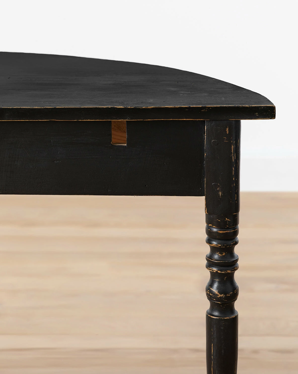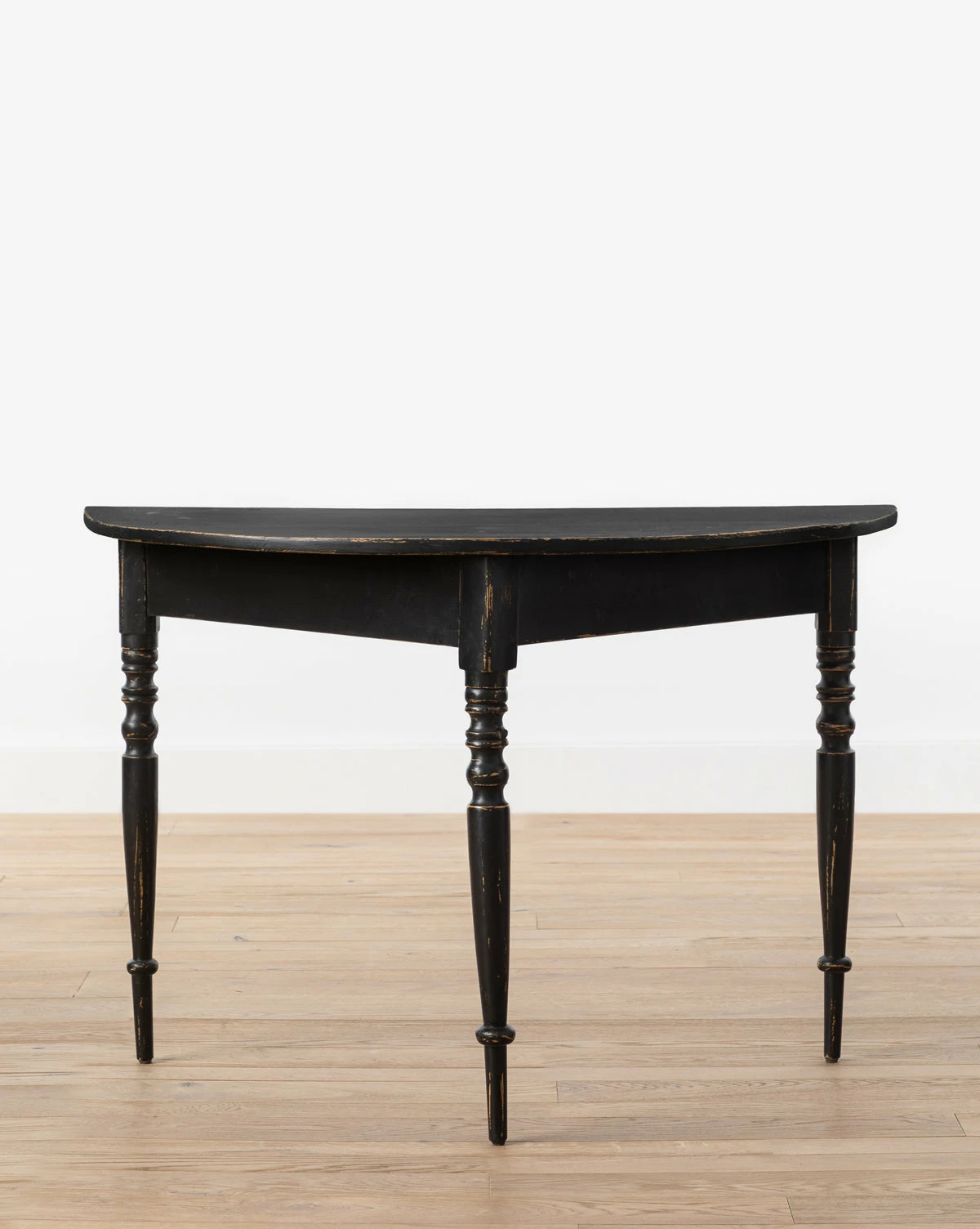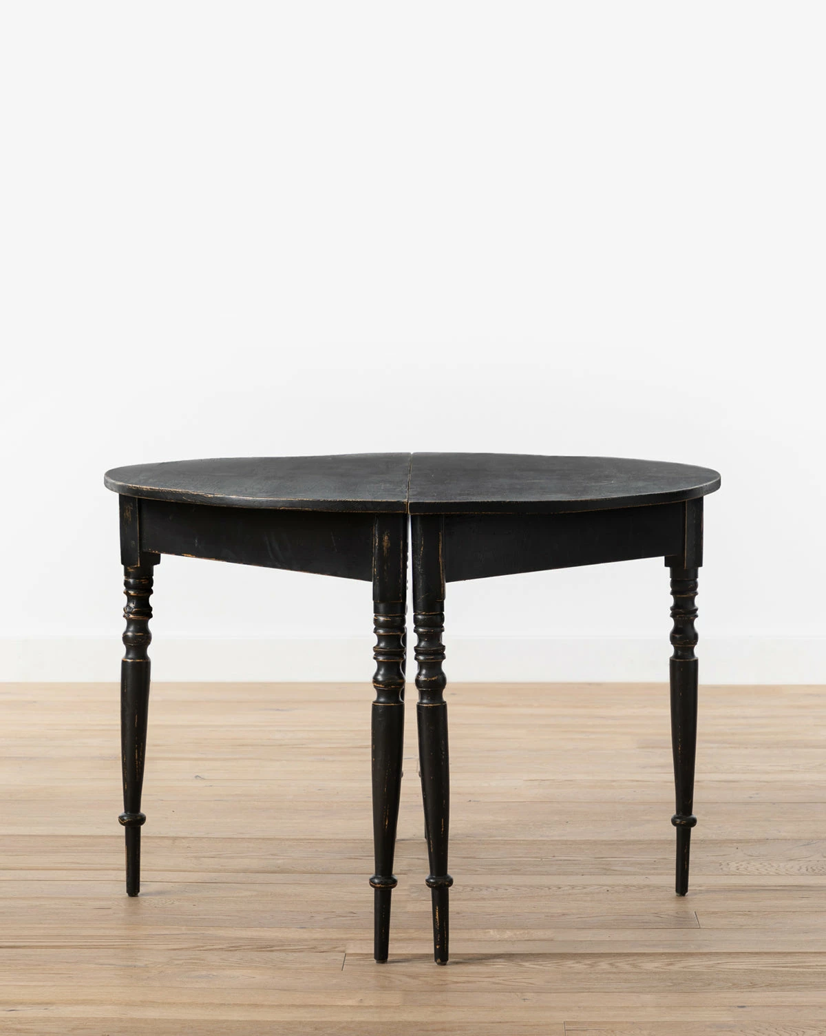 Originally from Sweden in the late 1800s, the Vintage Painted Black Swedish Demi Lune Tables were touched up with black paint at some point during the last century, adding layers of history to the classic demi lune tables. As part of our Vintage Collection, these vintage tables were hand-selected by our team for the unique character, heirloom quality, and beauty they will add to the home.