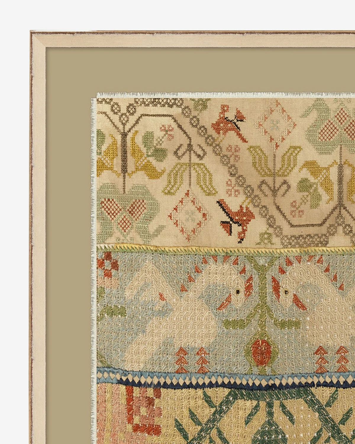 With charming detail and a decorative composition, Vintage Textile I brings the beauty of textile craftsmanship to your decor with a colorful palette. Framed within a distressed ivory wood frame, this giclee print on raw canvas features frayed edges and a sophisticated mounting on a mat. Â