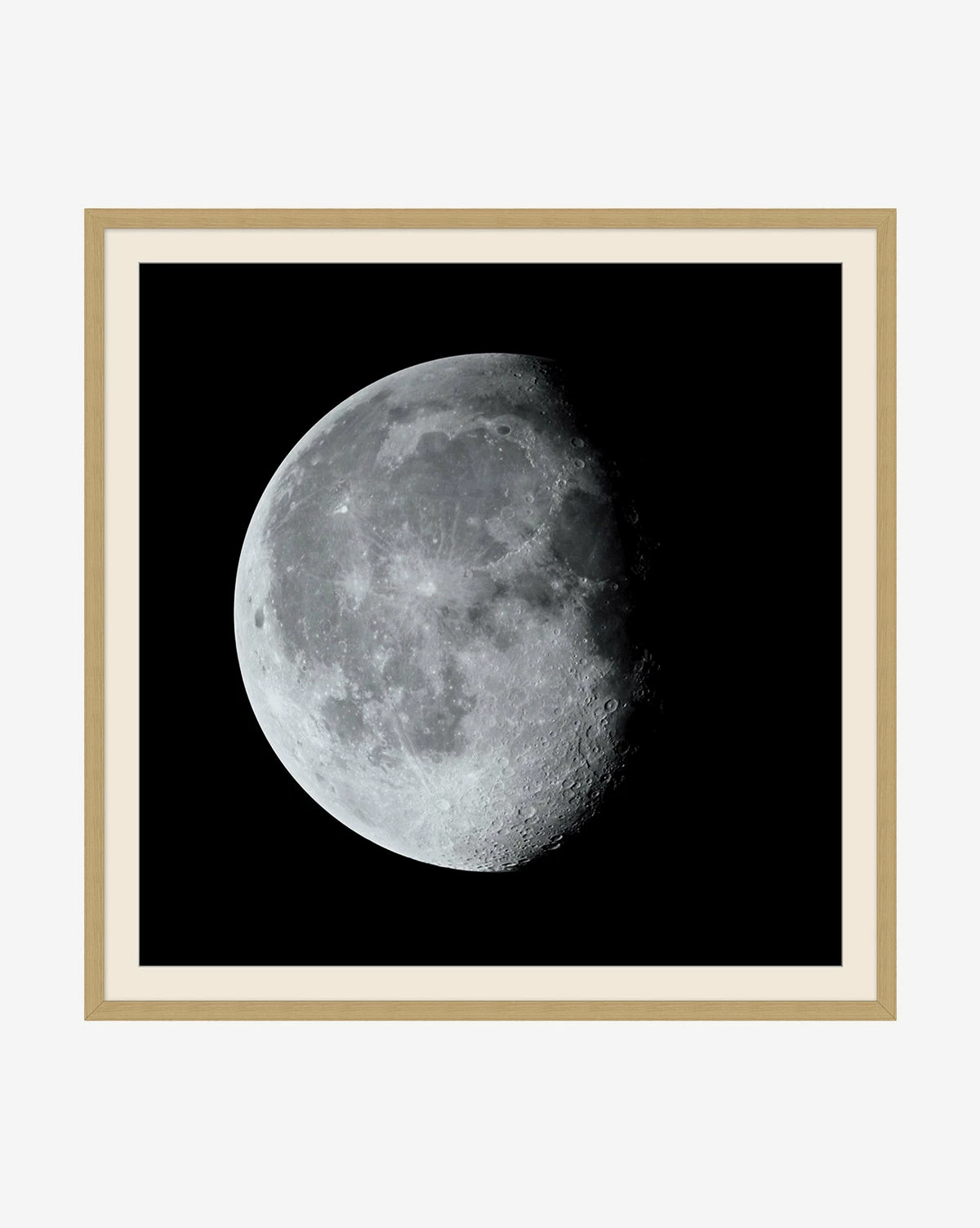 With captivating detail and a dramatic composition, Waning Gibbous depicts the natural beauty of the moon with photographic mastery. Framed within natural wood, this giclee print on matte paper brings character and intrigue wherever it is styled. Â