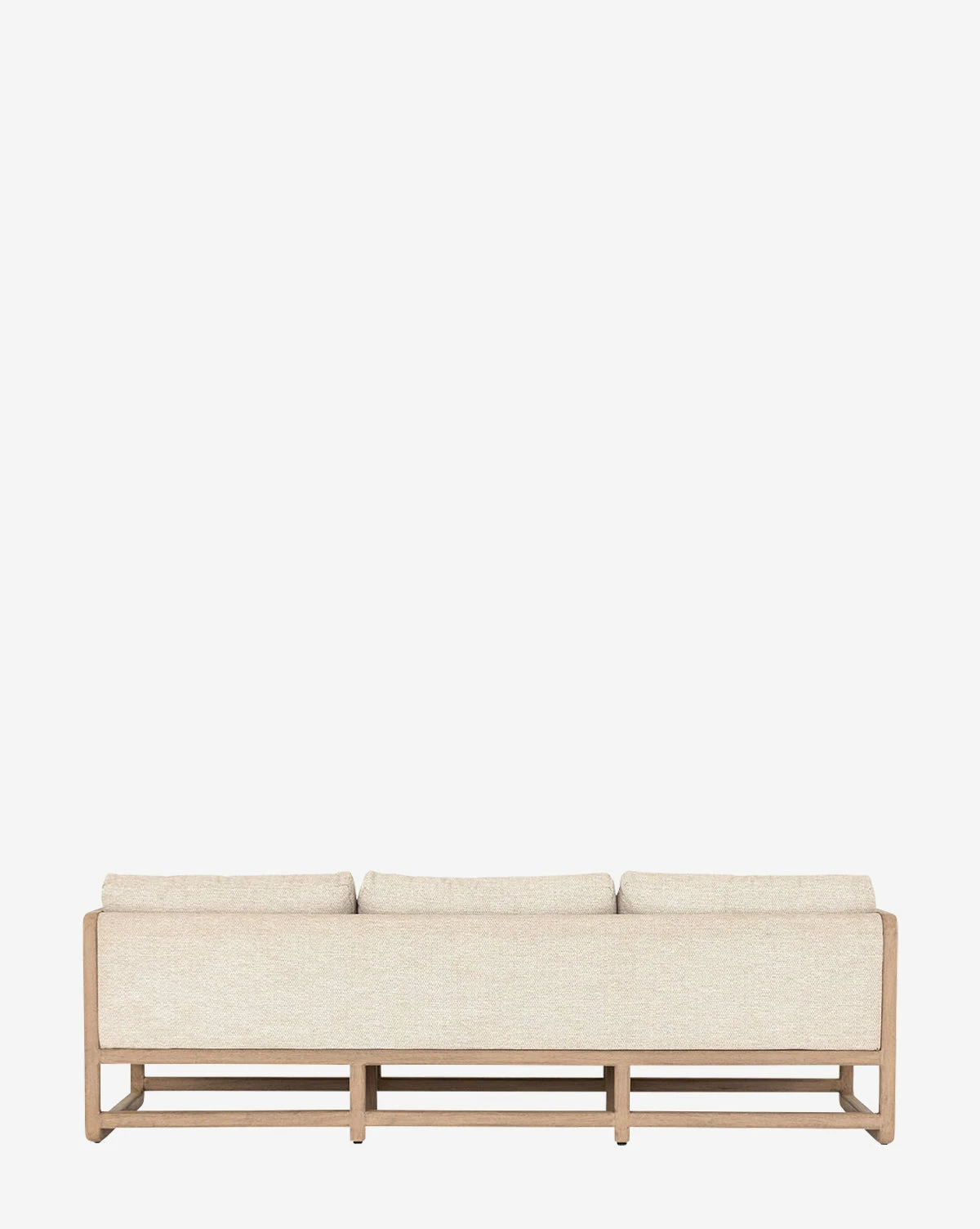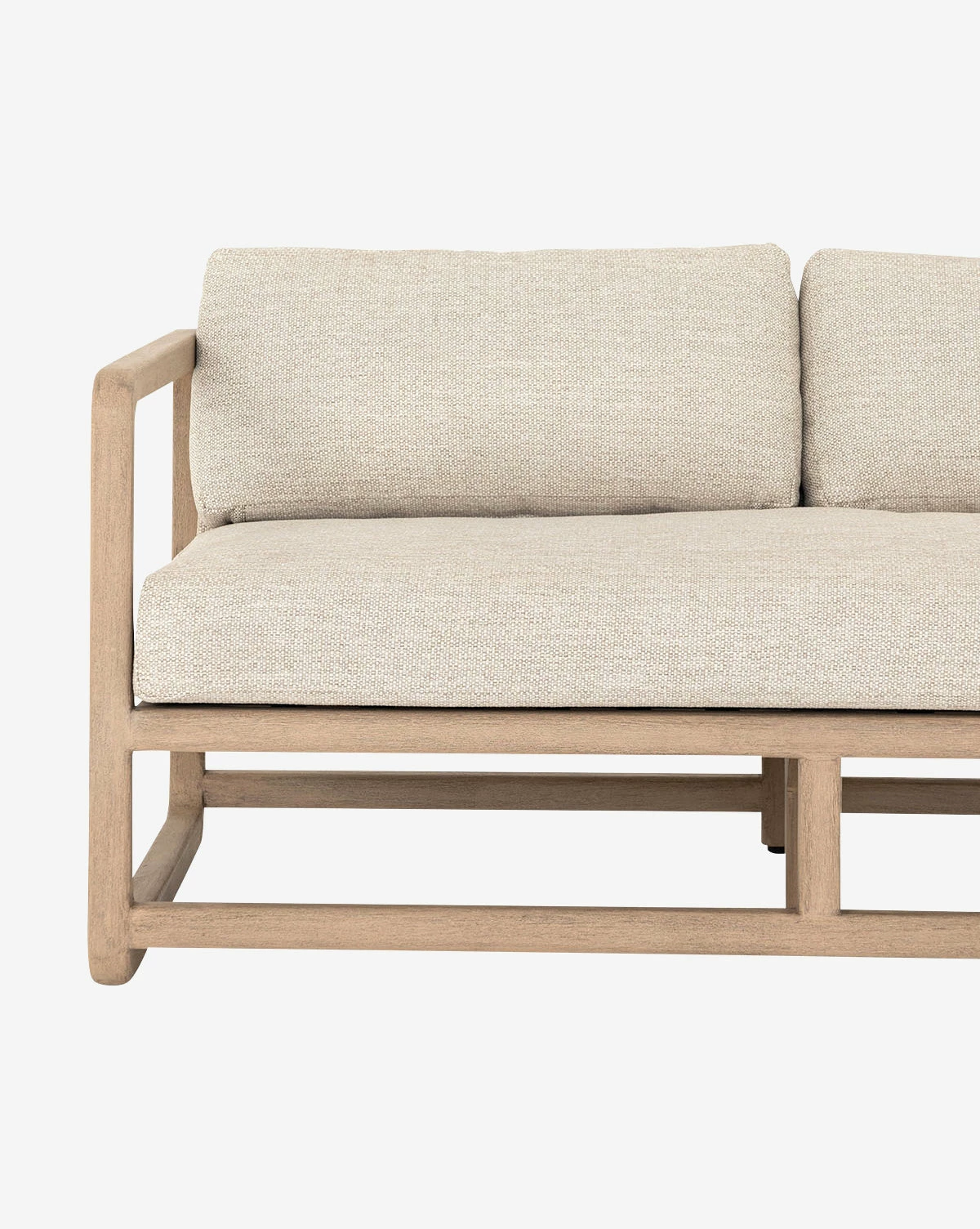 Crafted from teak and finished in a washed brown hue, the smooth curves of the Wembley Outdoor Sofa create an eye-catching moment within your outdoor styling. Upholstered in a neutrally toned outdoor-friendly fabric, this effortlessly comfortable bench seat sofa brings the best of both form and function wherever it’s placed.