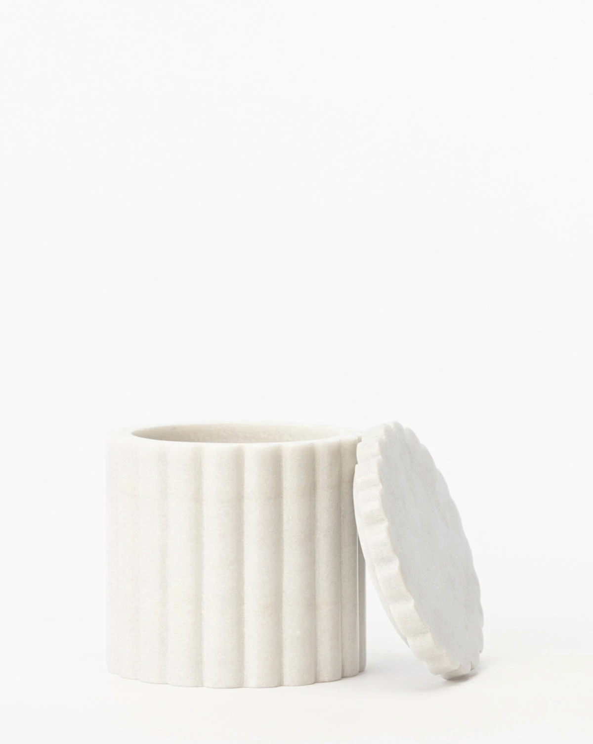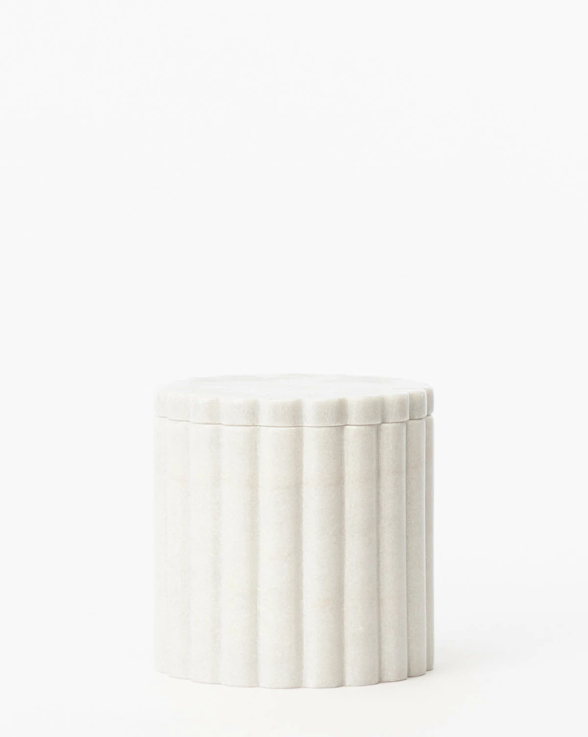 Charming in design, the White Marble Canister is beautifully nuanced. Crafted from white marble in a whimsical design, its wide, ribbed details extend effortlessly into its lid, making the piece cohesive and seamless. Its clean white coloring is subtly marbled, giving a soft touch of detail to its natural material.