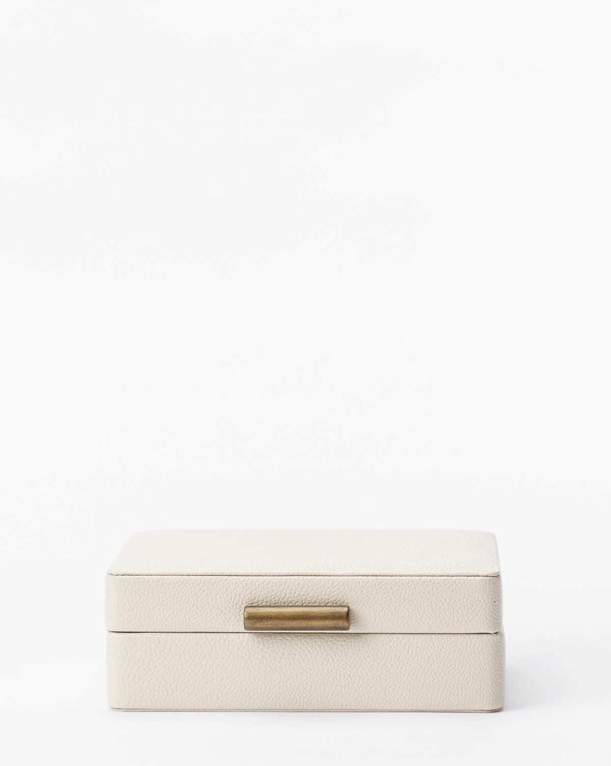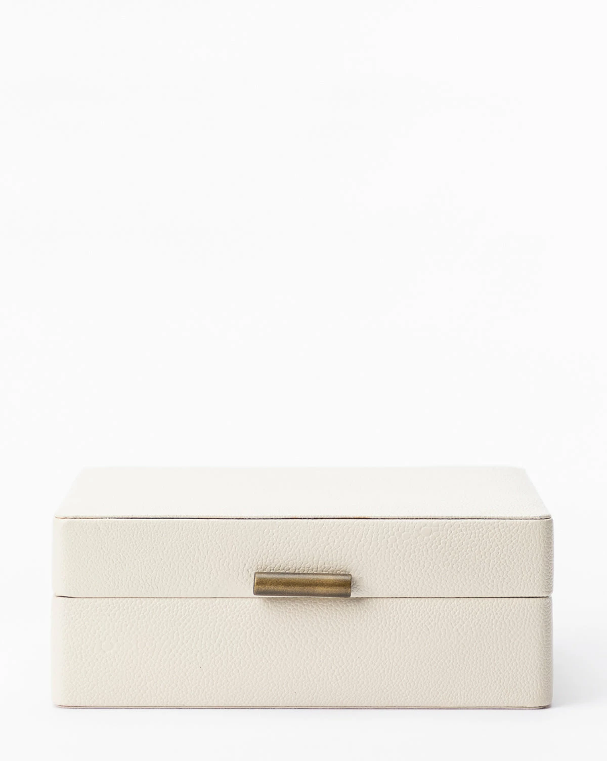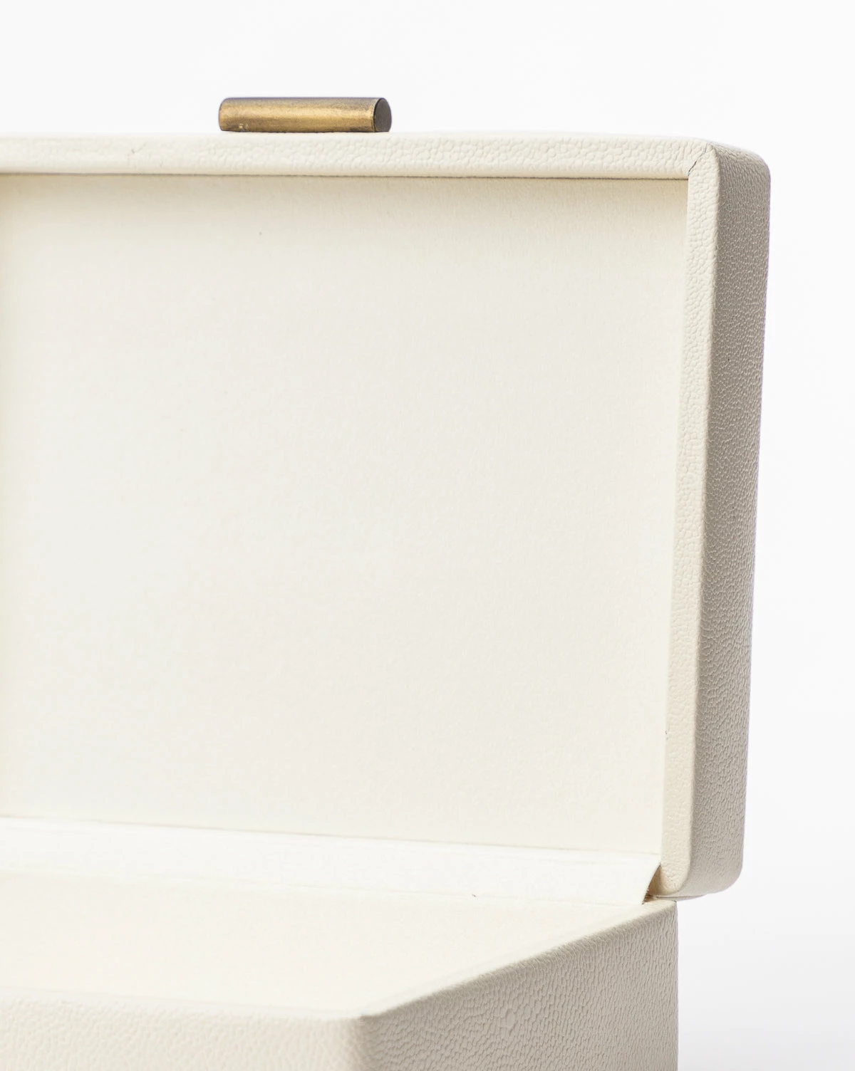 Finished in white shagreen with soft edges, the White Shagreen Box is perfect for adding height and interest to styling while also serving as a small, functional storage space. Complete with beautiful metallic hardware for a mix of materials that accentuates its leather construction, the White Shagreen Box gives soft visual appeal to your space.