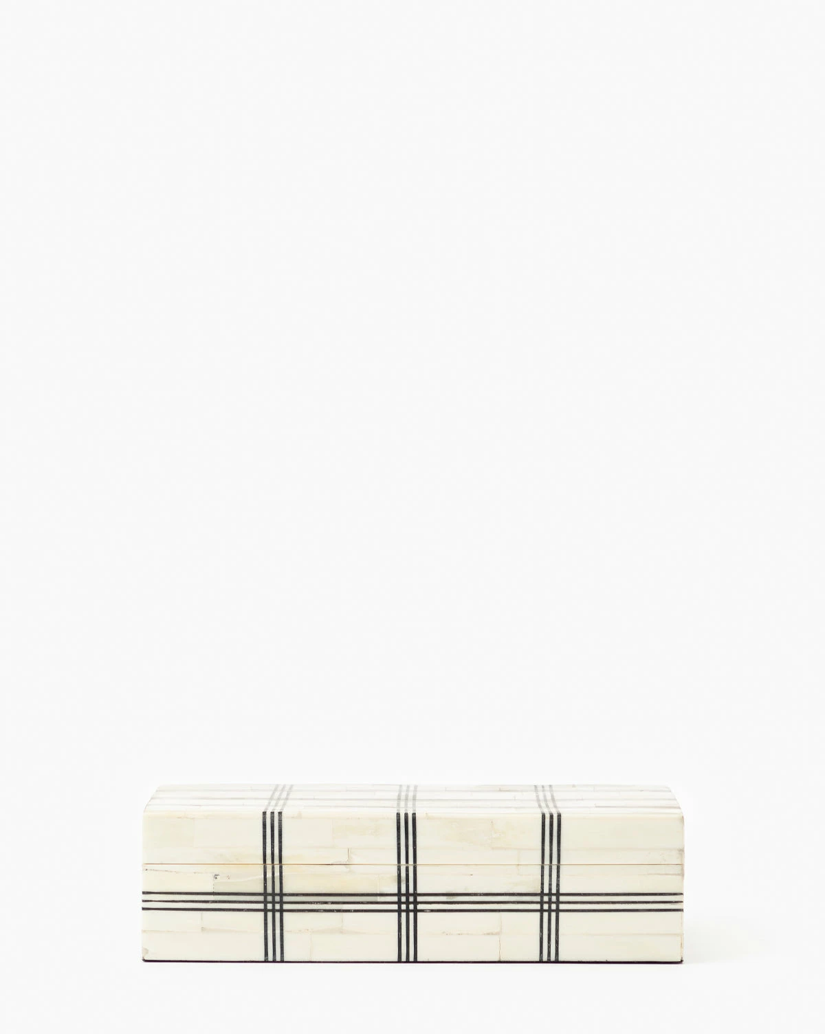 White bone with thin stripes in a wide grid, this box is not only eye-catching but handy! Use to store knick-knacks and style on your coffee table, console, or bookshelf.