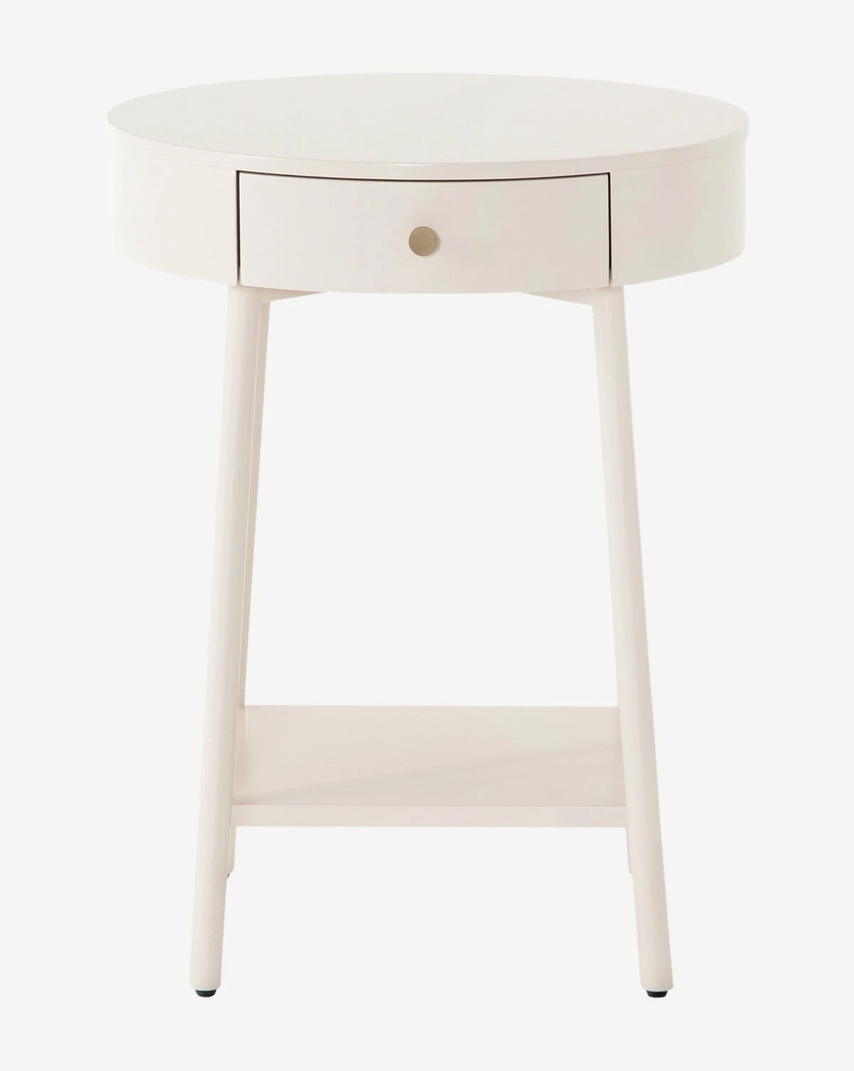The Zenon Nightstand has a clean, simple design that’s perfect for smaller spaces. A single drawer and lower shelf offer convenient bedside storage to keep must-haves within reach. Crafted from hardwood in a round, soft shape, the Zenon Nightstand is finished in an elegant off-white, making this piece go with nearly any decor.
